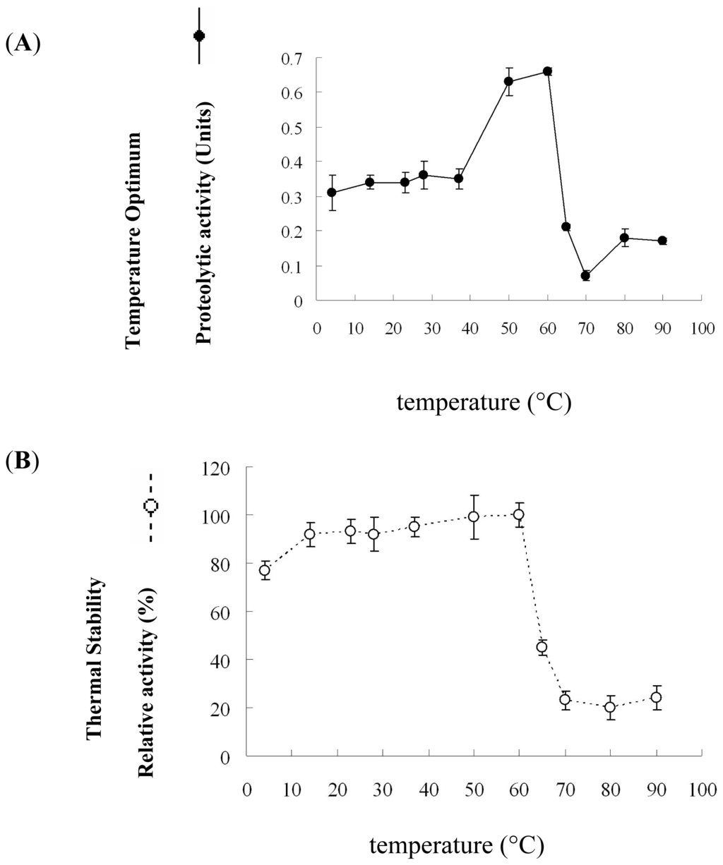 Optimum temperature range of activity (A) and stability (B) of the P. luminescens protease. For the determination of short-term temperature stability assay, the protease was incubated in 200 mM Tris-HCl buffer pH 8 for 30 min. For the buffers used and the conditions of the measurement, see the Experimental Section.
