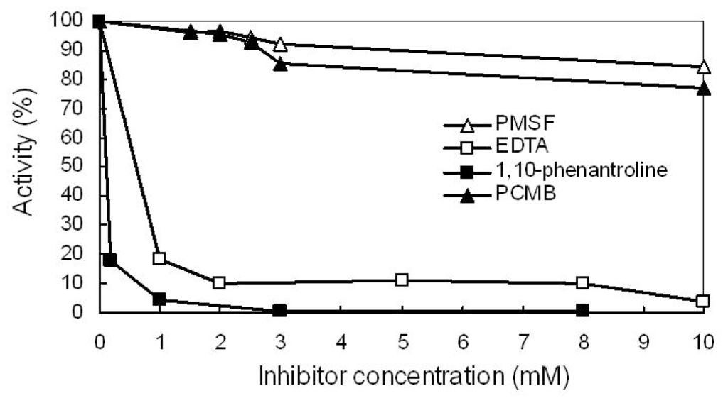 Little inhibition was observed with PMSF and PCMB (Figure 6), which are inhibitors of serine and thiol proteases, respectively. However, significant levels of inhibition were observed following incubation with either EDTA (a general metalloprotease inhibitor) or 1,10-phenanthroline (a zinc metalloprotease inhibitor, but not specific for Zn). There was also a dose-dependent response to these two inhibitors at concentrations between 0.2 and 10 mM (Figure 6). These data are consistent with the supposition that the enzyme might be a Zn metalloprotease.