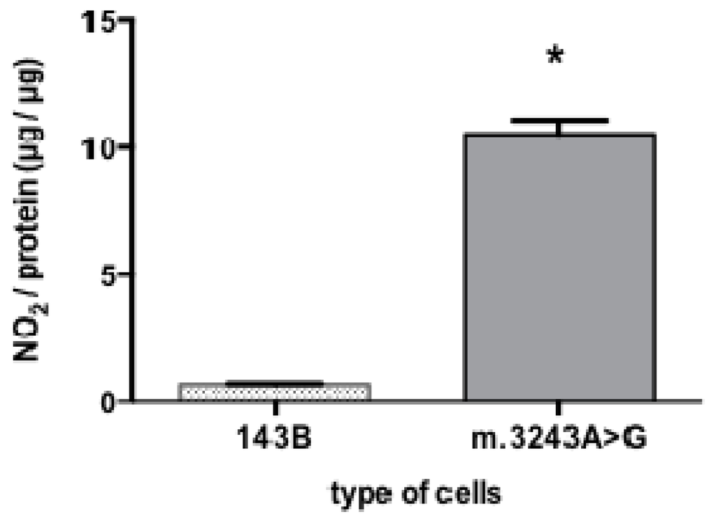 Because NO is a gaseous molecule with short half-life, direct NO detection and quantification is very difficult. Nitrite (NO2−) and nitrate (NO3−) are stable metabolites of NO and can be easily measured in body fluids, so the determination of nitrite is an indirect method but frequently used to evaluate NO production [14]. Our results showed that cells with m.3243A>G had a significant increase in the mean value of nitrite content (10.55 μg of nitrite per microgram protein) while 143B cells had only 0.68 μg of nitrite per μg protein (Figure 2).