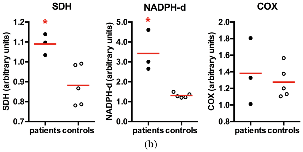 Quantitative analyses of histological staining of skeletal muscle vessels confirmed the increased mitochondrial content in patients with m.3243A>G mutation (mean = 1.09), with statistically significant increase in SDH staining in the vessels when compared to controls (mean = 0.88), typically found in SSV (Figure 5). A similar increase in NADPHd staining was also observed in SSV (mean in patients = 3.42, mean in controls = 1.31), suggesting that an increase in NOS activity or content of the enzyme. COX staining was not statistically significant (mean in patients = 1.38; mean in controls = 1.28) and did not increase proportionally to the SDH staining, suggesting a partial COX deficiency in skeletal muscle vessels.