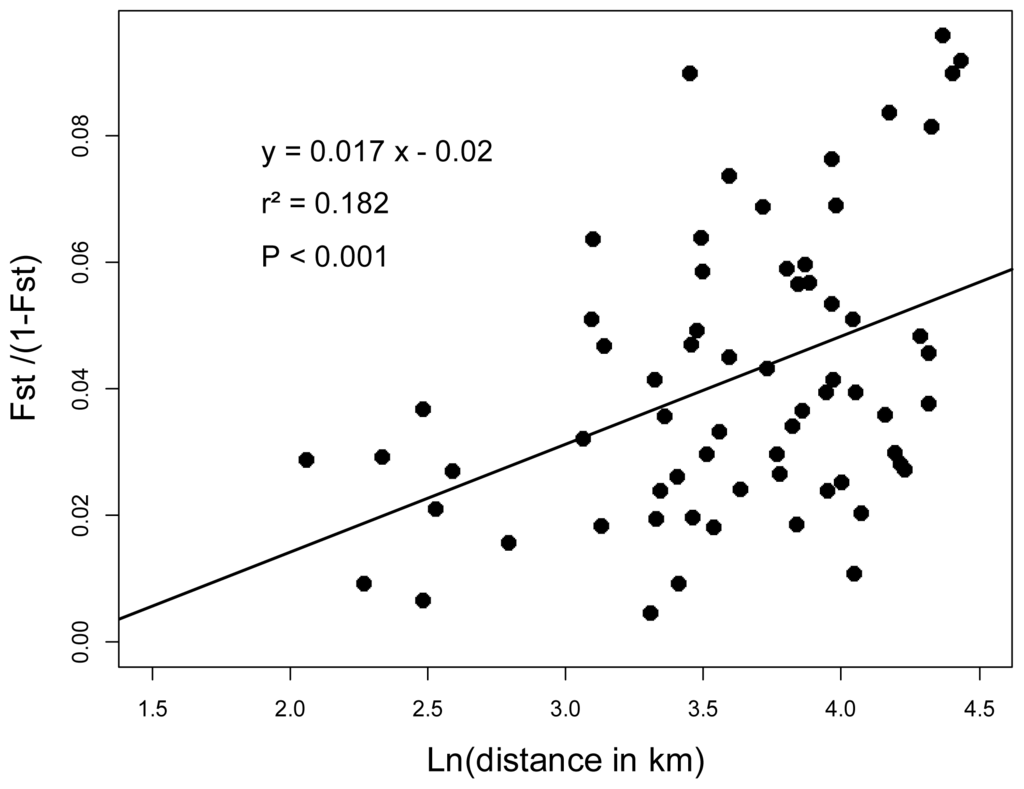 When considering all 11 loci, the expected genetic diversity within population was always high, ranging from 0.518 to 0.589 (overall mean: 0.547). The genetic differentiation among all populations, as measured by FST, was 0.04. This indicated large population sizes and/or high gene flow, as expected in an allogamous plant species [12]. Although low, the genetic differentiation among populations was highly significant (p-value < 0.001). Pairwise FST values computed for all possible pairs of populations ranged from 0.009 to 0.087. A significant linear relationship was observed between pairwise FST/(1 − FST) values and the natural logarithm of geographical distances between populations (r2 = 0.182; p < 0.001) (Figure 1). This indicates isolation-by-distance among populations [16].
