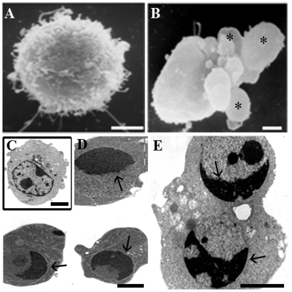 Control (A) and Ultraviolet B (UVB)-treated (B) HL-60 cells at Scanning Electron Microscopy (SEM). Surface blebbing (B, asterisks), absent in the control (A), appears. Control (C) vs. treated U937 (D) cells and treated Molt-4 (E) cells at Transmission Electron Microscopy (TEM). Condensed chromatin, organized in cup-shaped masses (arrows) under the nuclear envelope, can be observed in both cases (D,E). Scale bars: A–C, 2 μm; D,E, 1 μm.