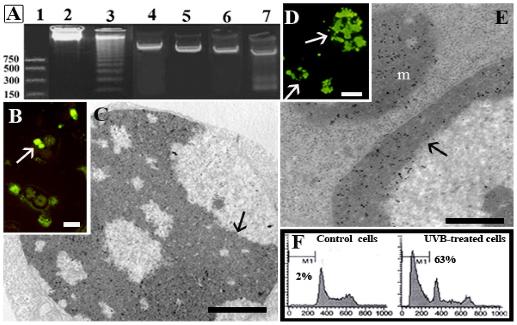 This review demonstrates that UVB radiation induces apoptosis in various cell lines using different approaches: Scanning (SEM) and Transmission (TEM) Electron Microscopy used to evidence morphological features, such as surface blebbing, cytoplasm shrinkage and chromatin condensation [–]; agarose gel electrophoresis and TUNEL reaction, the latter both at fluorescence and electron microscopy, used to investigate DNA [–]; and flow cytometry used to analyze cell cycle patterns and mitochondrial activity [,].