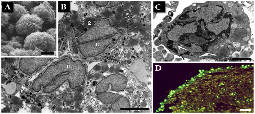 Untreated chondrocytes at SEM (A) and TEM (B). Condensed chromatin can be observed after UVB treatment (C), where pore translocation appears at diffuse chromatin level (arrows). Nuclear TUNEL-positivity is shown at fluorescence microscope (D). n: nuclei; g: lipid granules. Scale bars: (A–C) 5 μm; (D) 40 μm.