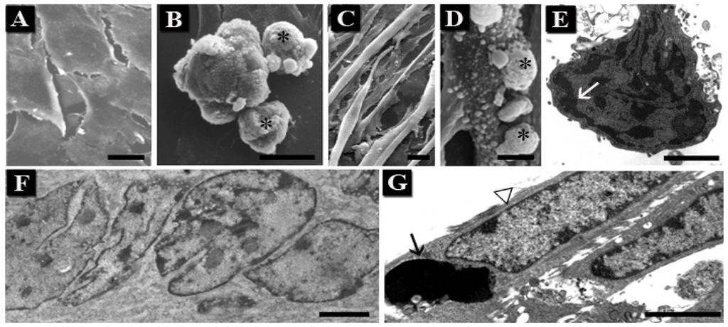Surface blebs (asterisks), absent in control myoblasts (A) and myotubes (C), appear after UVB treatment (B and D) at SEM. Myoblast chromatin condensation (arrow) can be also revealed (E). TEM of control (F) and treated myotubes (G) shows nuclear peculiarities. In the latter normal (arrowhead) and apoptotic (arrow) nuclei coexist (G). Scale bars: (A–D) 10 μm; (E,G) 2 μm; (F) 2.5 μm.