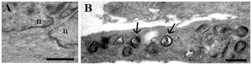 Autophagy occurs in UVB-radiation response of differentiated C2C12 cells. Autophagic vacuoles (arrows), absent in C2C12 control myotubes (A), appeared in UVB-treated myotubes (B). n: nuclei. Scale bars: (A) 2.5 μm; (B) 1 μm.