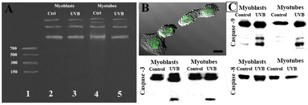 In our experiments, oligonucleosomic DNA fragmentation did not appear after UVB exposure in chondrocytes and skeletal muscle cells. The DNase responsible for the apoptotic DNA laddering and the precise molecular mechanisms are poorly understood in the case of these cell lines. Shiokawa et al. 2002 [] demonstrated that an olinucleosomic DNA fragmentation occurred in myoblasts only when apoptosis appeared during induction of differentiation.