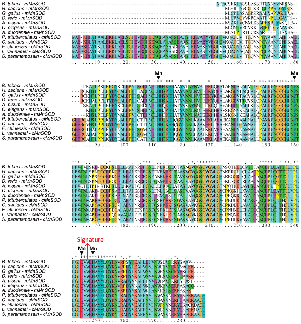 MnSOD is primarily found in prokaryotes and eukaryotic mitochondria [22]. Two types of MnSOD are known in eukaryotes: mitochondrial MnSOD (mMnSOD), with a mitochondrial transit peptide for translocation, and cytosolic MnSOD (cMnSOD) without the peptide [23]. In eukaryotic cells, mMnSOD is synthesized as a precursor protein in the cytosol and then imported into the mitochondrial matrix [21]. The mMnSOD is located in mitochondria and plays a vital role in defense against superoxide radicals generated as byproducts of oxidative phosphorylation [24]. cMnSOD has been identified and cloned in various crustacean species. The characterization and its role in immunomodulation have also been reported [19,25,26]. Preliminary studies showed that the overexpression of MnSOD can extend the life span of adult Drosophila melanogaster[27] and reduce oxidative stress in cells [28,29]. Recently, it was found that MnSOD may be involved in immune responses to stimulators, such as heat, coldness, starvation and heavy metals [30,31]. However, until now, information about the function of MnSOD in B. tabaci was still lacking.