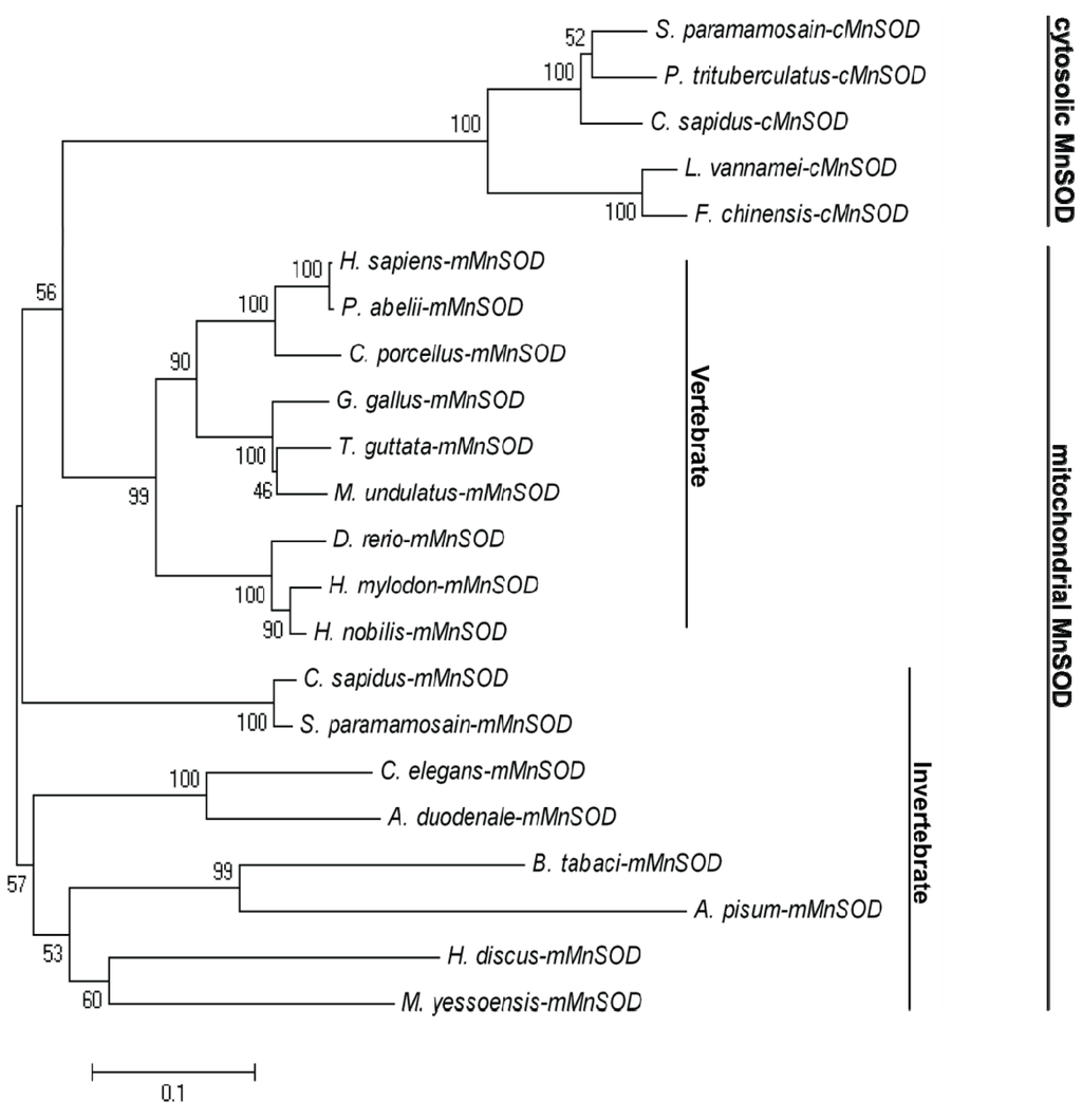 Phylogenetic relationships between mMnSODs and cMnSODs from 22 different species. A phylogenetic analysis was conducted based on a multiple alignment of amino acid sequences retrieved from the GenBank database. Numbers at the nodes are bootstrap values (1000 replications). The scale bar is 0.1.