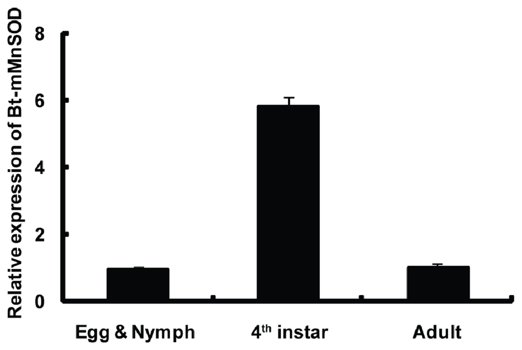 To better understand the physiological roles of Bt-mMnSOD, its expression was detected by qPCR in different developmental stages. The mRNA levels of Bt-mMnSOD were significantly higher in the 4th instar than in egg and nymph or adult (Figure 6). The result of qPCR suggests that Bt-mMnSOD might play important roles in the development of B. tabaci, especially in the 4th instar.