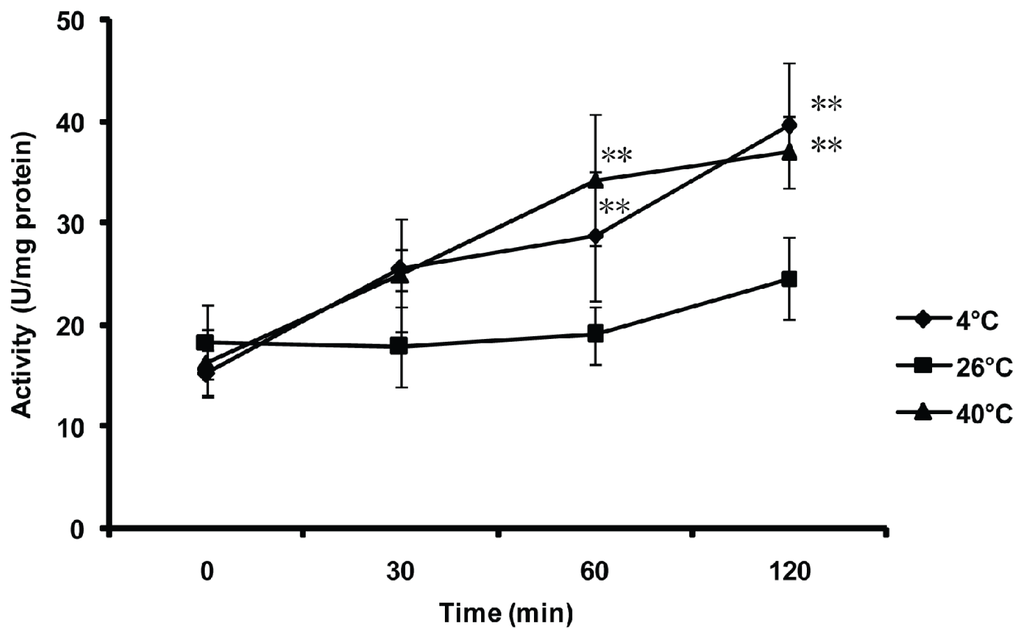 To evaluate the in vivo activity of the MnSOD in B. tabaci stimulated by external temperature stresses, B. tabaci adults were exposed to low (4 °C), medium (26 °C) and high (40 °C) temperatures for 0 (control), 30, 60 and 120 min, respectively (Figure 7). The activity of MnSOD significantly increased after incubation at low (4 °C) and high (40 °C) temperatures for 60 and 120 min, compared with control (p < 0.01). However, no significant differences were detected when the B. tabaci adults were exposed at 26 °C from 0 to 120 min or incubated at 4 °C and 40 °C in the initial 30 min.