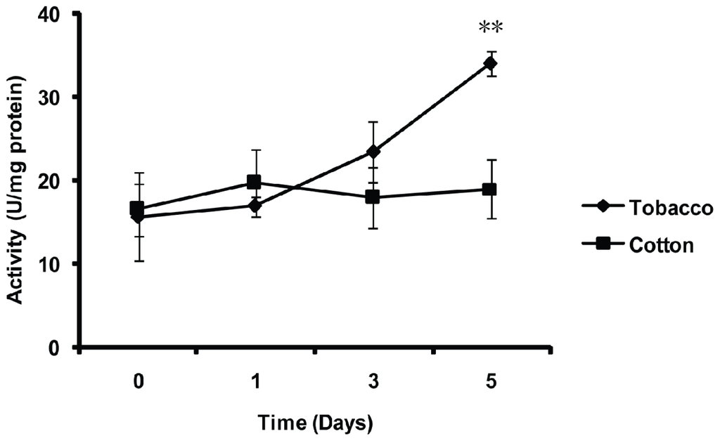 To characterize the effect of host shift on the in vivo activity of the MnSOD in B. tabaci, whitefly adults were transferred from cotton (a favorable host plant) to tobacco (an unfavorable host plant) for 0, 1, 3 and 5 days. When whiteflies were transferred from cotton to tobacco for 5 days, the activity of MnSOD significantly increased compared with 0 days (p < 0.01), whereas in the control (transfer from cotton to cotton), the level of activity remained unchanged (Figure 8).