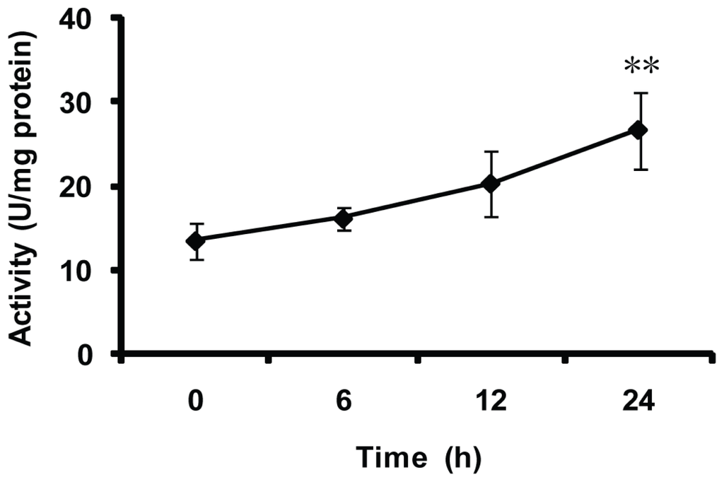 Furthermore, the activities of MnSOD were measured after the whitefly feeding on the imidacloprid-treated cotton plants for various durations (Figure 9). No significant differences were observed in the initial 12 h. However, after 24 h feeding on imidacloprid-treated cotton plants, a significant increase of MnSOD activity was detected compared with 0 h (p < 0.01).