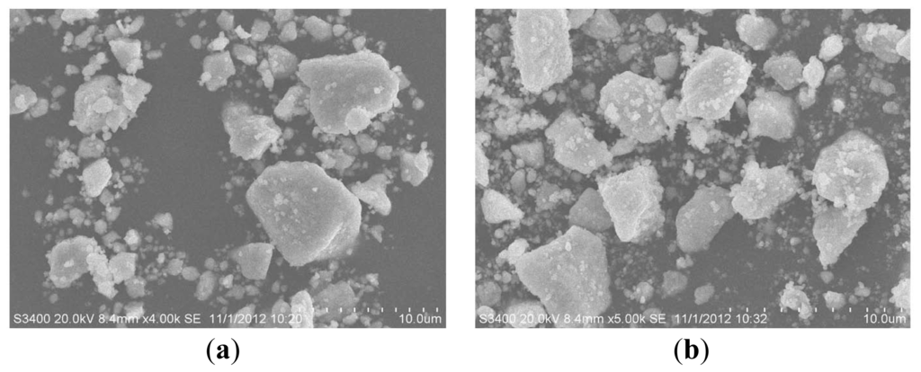 Figure 1a,b show the SEM images of Gd2InSbO7 and Gd2FeSbO7 with low magnification. Figure 1c,d show the TEM images of Gd2InSbO7 and Gd2FeSbO7 with high magnification. The results showed that the particle diameter of Gd2FeSbO7 was 240 nm and the particle diameter of Gd2InSbO7 was 310 nm. The nanosized particles of Gd2FeSbO7 and Gd2InSbO7 were obtained, and these particles were in inhomogenous global shapes. Figure 1 revealed that the average particle size of Gd2FeSbO7 was smaller than that of Gd2InSbO7. There were two reasons to obtain nanocrystals in this experiment, while synthesizing Gd2InSbO7 and Gd2FeSbO7 powders by the solid-state method. Firstly, the powders, which were obtained after a sintering process by an electric furnace, would be ground by mortar three times and then would be ground in a ball mill three times. The total time for grinding the above photocatalyst powders was approximately 15 h. Secondly, the sizes of the photocatalyst particles were different. We utilized a centrifuge to realize separation of the photocatalyst particles, which had different sizes by adjusting the rotation speed of the centrifuge, and the small particles were obtained. SEM-EDS spectrum taken from the prepared Gd2FeSbO7 indicated the existence of gadolinium, iron, antimony and oxygen. As to the prepared Gd2InSbO7, gadolinium, indium, antimony and oxygen were detected and other elements were not identified.