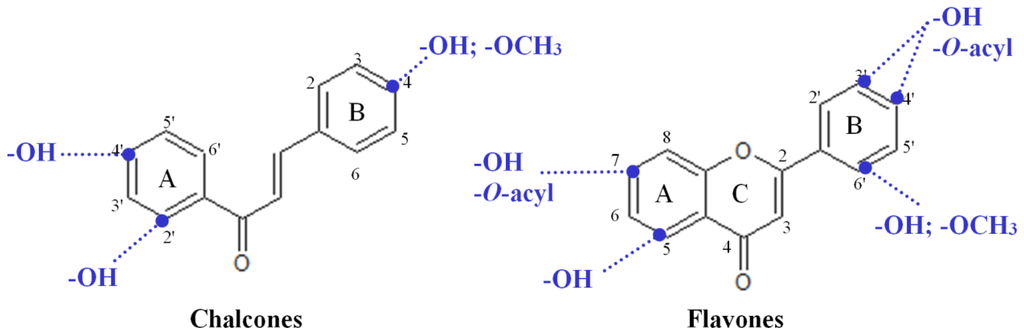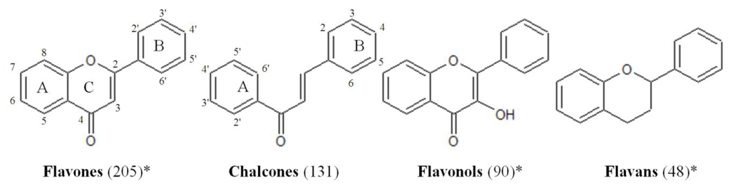 The most important flavonoid classes represented in the flavonoids chemical library. The amount of compounds per class present in the library is indicated between parentheses. Flavanones, isoflavonoids, neoflavonoids and dihydroflavonols are also included. * The numbering of the chemical structure of the flavonols and flavans is similar to the flavones, and it follows the criteria of [15].