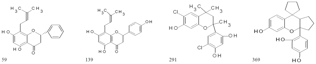 These ten highly active flavonoids were further retested at 100 μM (Scheme 1; Table 1), and the high activity was only preserved in four molecules: two flavanones (59, 139) and two flavan derivatives (291, 369). Their structures are shown in Figure 4.