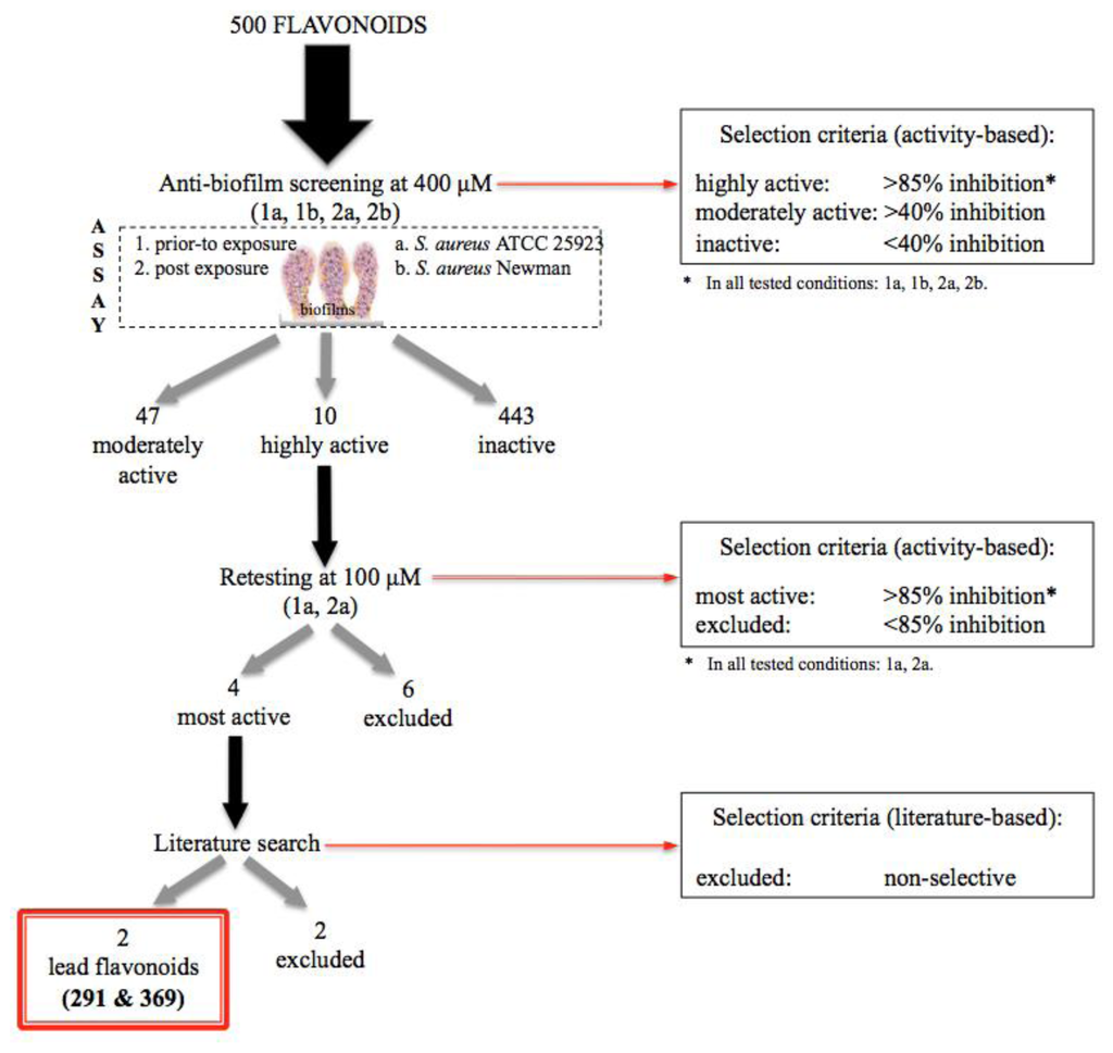 To avoid identifying only strain-specific hits, the initial screening was performed simultaneously against two clinical S. aureus strains, and only those flavonoids highly active against both strains and in both exposure paradigms (prior-to and post-biofilm formation) were chosen for further study (selection criteria are discussed in Section 2.2). Moreover, all the tested compounds were obtained from the same company (TimTec, see Section 3.1), to avoid differences due to the source. In Table S1, a list of the flavonoids library is included. Their structures can be retrieved with the company codes using the freely available TimTec database ( http://www.echemstore.com/). Trivial names of the natural flavonoids, as well as short names of the natural derivatives were also compiled and included in this Table. All the 500 flavonoids used in this study were prepared in 20 mM in dimethylsulfoxide (DMSO), as this is the most widely used solvent for the solubilization of large chemical libraries. Precipitation upon dilution in DMSO was recorded for 31 flavonoids (Table S1). All the precipitated samples corresponded to being inactive, most likely because precipitation lowers the compound concentration in the solution, resulting in an underestimation of the anti-biofilm activity [26]. However, the population of non-entirely solubilized flavonoids accounted for less than 6.5% of the total collection and, therefore, has a minimal impact on the usefulness of this study.
