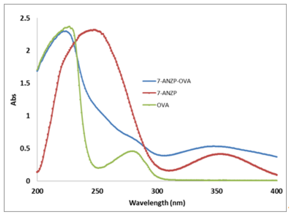 On the UV-vis spectrum of ANZP-OVA conjugate, an absorbance peak was observed at 355 nm, which is one of the characteristic peaks of 7-ANZP. An absorbance maximum was also found at 245 nm along with a smaller peak at 280 nm, which integrated the characteristic peak (245 nm) of 7-ANZP and the characteristic peak (280 nm) of OVA (Figure 2). These changes on UV-vis spectra showed that the conjugate, ANZP-OVA, could be used for further ELISA development.