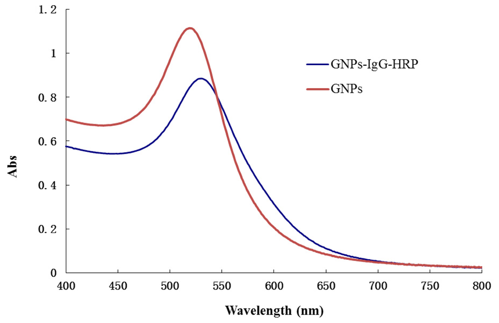 A novel enzyme tracer was prepared by conjugating IgG-HRP with GNPs. The initial maximum absorbance peak of the GNPs at 520 nm was shifted to 529 nm after conjugation with IgG-HRP molecules (Figure 3), which can be expected based on the local surface plasmon resonance phenomenon [13]. This size expansion indicated the successful conjugation of the GNPs and IgG-HRP. It was important to note that the GNPs -IgG-HRP conjugate was also mono-disperse (data not shown), which will contribute to the reproducibility of the GNPs-based ELISA method.