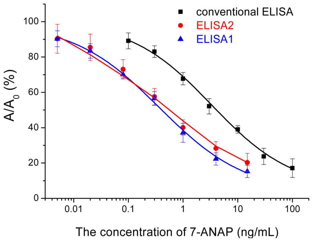 For application of the GNPs-IgG-HRP conjugate in ELISA format, the concentrations of coating antigen, anti-7-ANZP antibody and the GNPs-IgG-HRP conjugate firstly were selected by the checkerboard method. Blocking buffer containing proteins or polymers (ovalbumin, gelatin from pork skin, polyvinyl pyrrolidone (PVP, average mw 40 kDa, PEG-10000) were also compared to obtain highest signal to noise ratio. Blocking buffer containing gelatin (0.1%) was chosen (data not shown). Under optimized concentrations of coating antigen, anti-7-ANZP antibody and the GNPs -IgG-HRP conjugate, the sensitivity (defined as the concentration when A/A0% was 90%) could reach 5.6 pg/mL, which was nearly 20 times more sensitive than that of the traditional ELISA for 7-ANZP (Figure 4). The linear range of this nano-ELISA was 0.01~4 ng/mL (the linear equation was y = −24.338 × lgx + 39.608, R2 > 99%). These results demonstrated multiple IgG-HRP molecules loading onto the surface of GNPs had endowed the conjugate producing signal amplification effect. The signal amplification effect in this method was close to that of another GNPs-based ELISA for heavy ion [19]. Note that the performance of this nano-enhanced ELISA can be improved further through more elaborate design, for example, optimizing the size of GNPs, adopting other kinds of bigger nanoparticles, or directly conjugating IgG and HRP to improve the loading of HRP molecules per GNP.