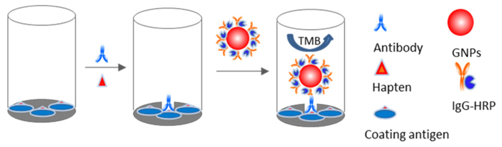 The procedure of the nano-enhanced ELISA was almost the same as that of a traditional indirect ELISA method except that the IgG-HRP was replaced with the GNPs-IgG-HRP conjugate. The general procedure developed in the assay was as follows. 100 μL of 7-ANZP-OVA (15 μg/mL) was added to each well of a 96-well microplate and immobilized at 37 °C for 2 h. Coating antigen was decanted and microplates were washed by PBST. The microplates were then blocked by incubating with 200 μL of blocking buffer (1% BSA in PBST) for 2 h at room temperature. After decanting the blocking buffer and washing the microplates, 50 μL of 7-ANZP standard solutions, or test samples, and 50 μL of anti-7-ANZP antibody solution in PBST buffer containing 0.1% gelatin were added to the wells. The microplates were then incubated at 37 °C for 30 min. The reaction mixtures in wells were then decanted and the wells were washed, then 100 μL of diluted GNPs-IgG-HRP conjugate was added to the each well. After incubation for 30 min, the wells were washed again. HRP substrate containing TMB and H2O2 solutions was added and color was developed for 15 min. Then the reactions were stopped by addition of 2 M sulfuric acid (100 μL) to each well. The optical density was read at 450 nm with a microplate reader within 5 min after stopping the reaction.