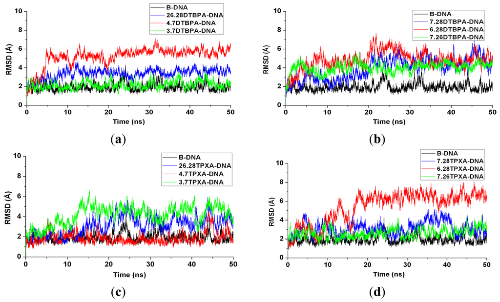 Root-mean-square deviation (RMSD) values of all the backbone atoms with respect to the corresponding starting structures for: (a) simulations of B-DNA (black), 26.28DTBPA-DNA (blue), 4.7DTBPA-DNA (red) and 3.7DTBPA-DNA (green); (b) simulations of B-DNA (black), 7.28DTBPA-DNA (blue), 6.28DTBPA-DNA (red) and 7.26DTBPA-DNA (green); (c) simulations of B-DNA (black), 26.28TPXA-DNA (blue), 4.7TPXA-DNA (red) and 3.7TPXA-DNA (green); (d) simulations of B-DNA (black), 7.28TPXA-DNA (blue), 6.28TPXA-DNA (red) and 7.26TPXA-DNA (green).