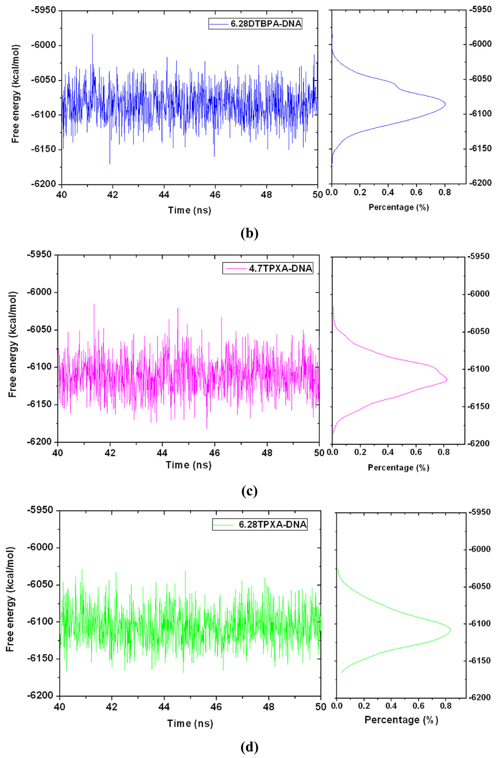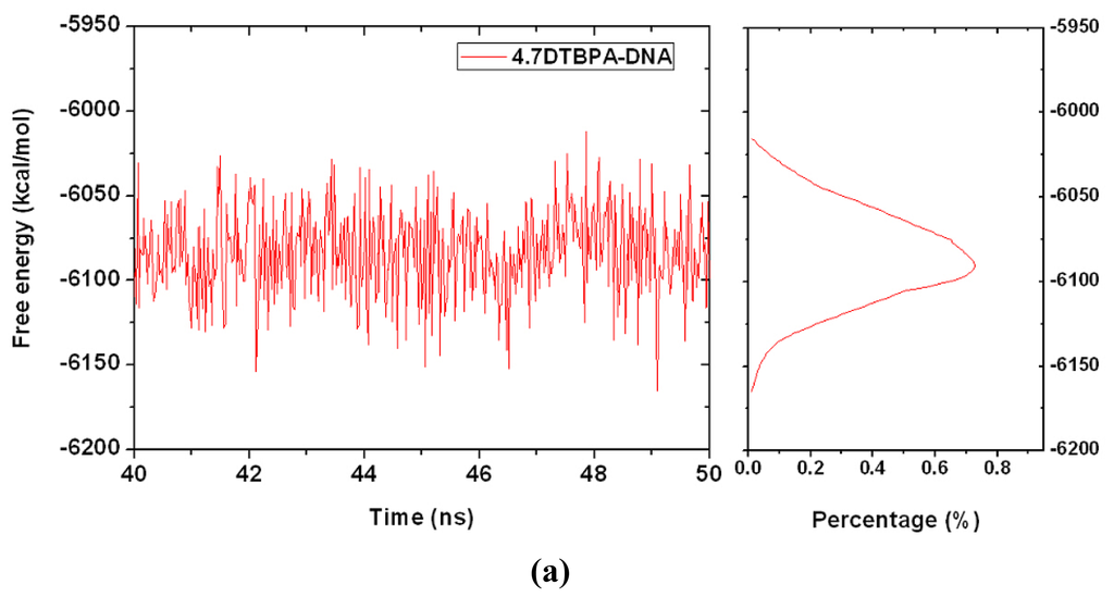 Conformational stability free energy (kcal·mol−1) and integrated distributions for (a) 4.7DTBPA-DNA (red); (b) 6.28DTBPA-DNA (blue), (c) 4.7TPXA-DNA (magenta) and (d) 6.28TPXA-DNA (green).