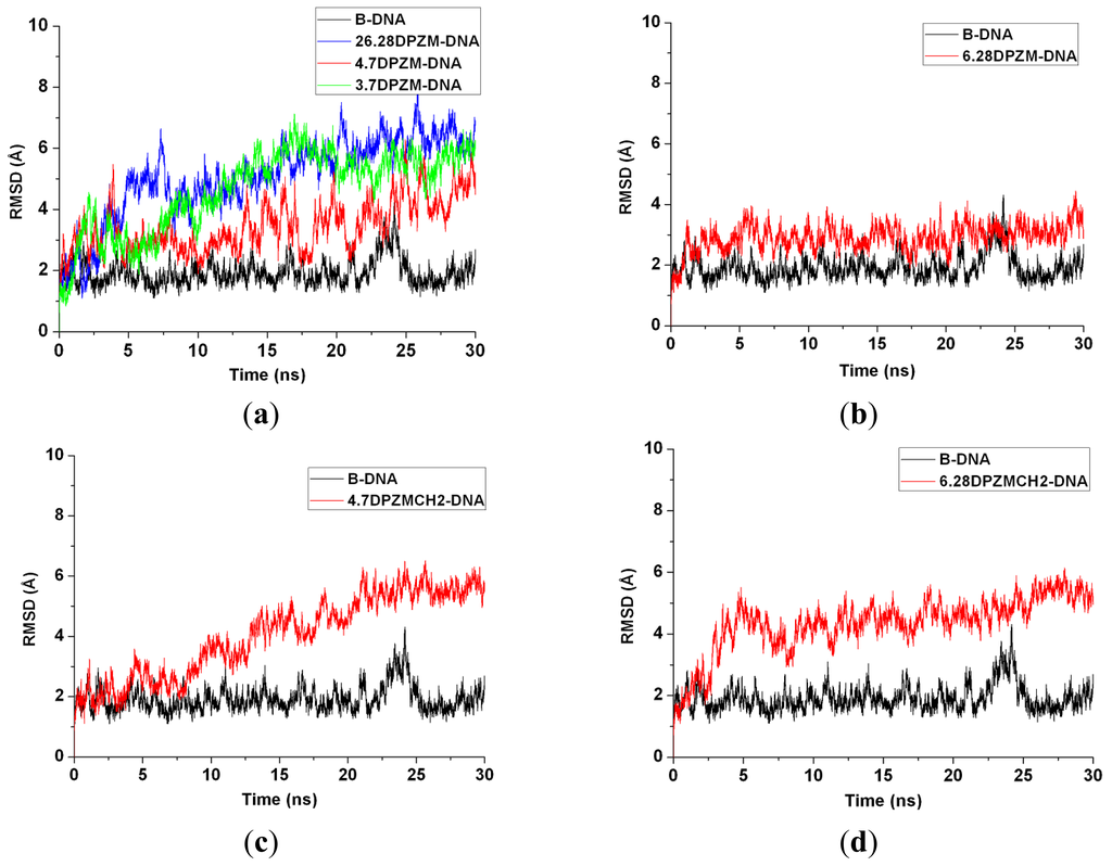 RMSD values of all the backbone atoms with respect to the corresponding starting structures for: (a) simulations of B-DNA (black), 26.28DPZM-DNA (blue), 4.7DPZM-DNA (red) and 3.7DPZM-DNA (green); (b) simulations of B-DNA (black) and 6.28DPZM-DNA (red); (c) simulations of B-DNA (black) and 4.7DPZMCH2-DNA (red); (d) simulations of B-DNA (black) and 6.28DPZMCH2-DNA (red).