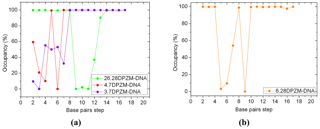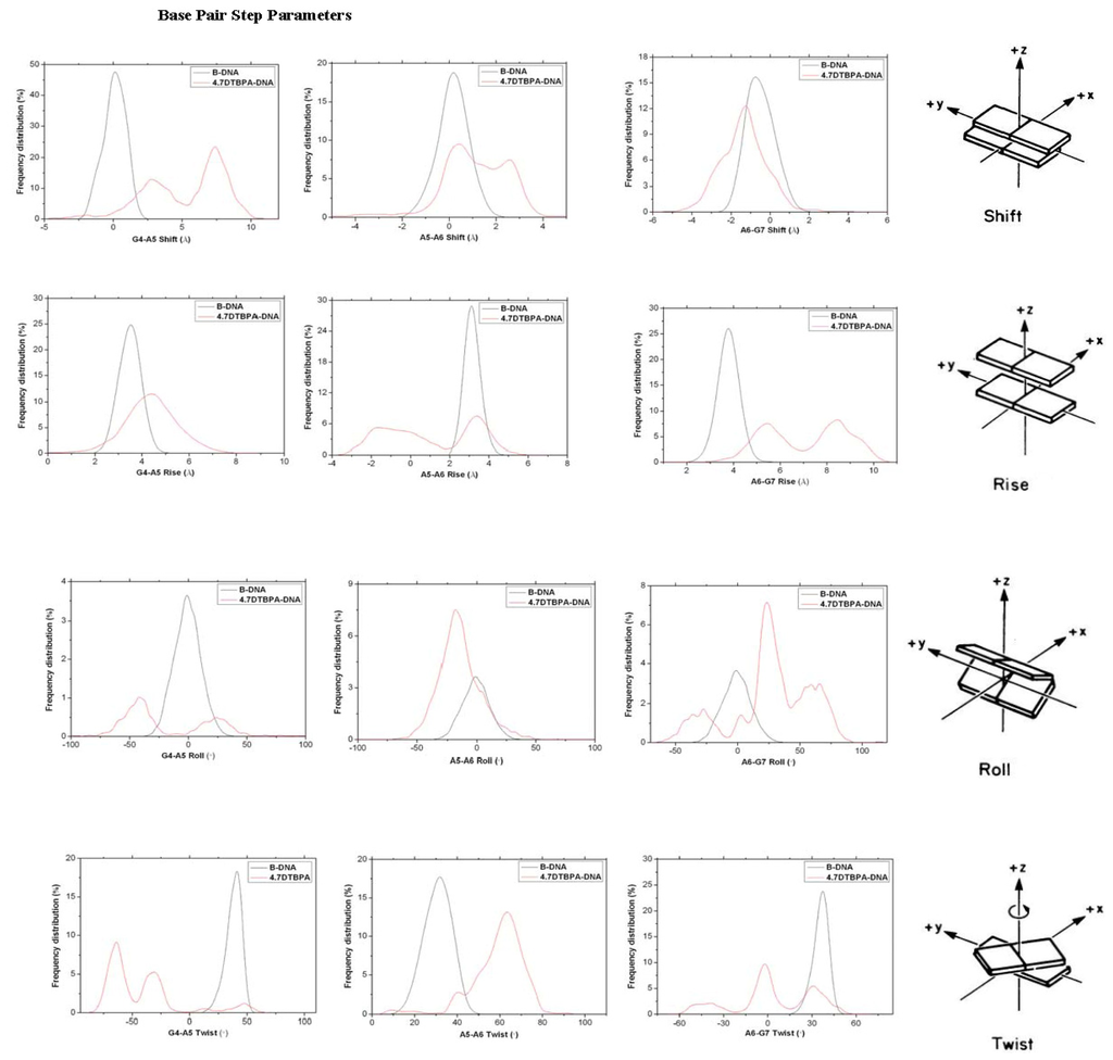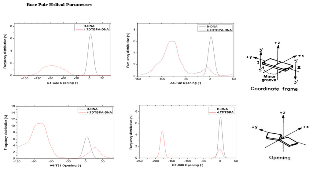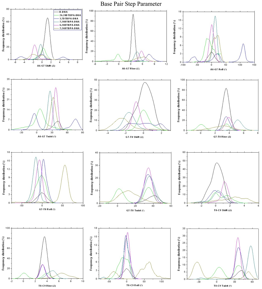 The [Pt2(DTBPA)Cl2](II) and [Pt2(TPXA)Cl2](II) agents disturb the DNA conformation through the covalent binding of the platinum centers to the N7 atoms of the DNA bases, and simultaneously, the locating of the corresponding large ligand of the agent to the major groove. The processes of DNA conformational dynamics result in changes in the DNA groove parameters. The frequency distributions of the DNA helical dynamics parameters have been analyzed, and are shown in Figure 7 for the 4.7DTBPA-DNA adduct, and in Figure A8 for the other 11 models of Pt2(DTBPA)/Pt2(TPXA)-DNA. In general, groove width and depth were measured mainly from the opening, twist and rise motions, and the shift motion, respectively, of the DNA base pair helixes or steps, as defined by CURVES analysis [43–45]. For example, for the 4.7DTBPA-DNA model (see Figure 7), the opening parameters of the DNA base pair helixes at connection sites G4:C33, A5:T32 and A6:T31 were changed ~−90°, ~−80° and ~−80°, respectively, away from the B-DNA molecule (compared with ~0° for the B-DNA molecule); the deviations in the twist angle values were ~20°, ~30° and ~−35° for the G4·A5, A5·A6 and A6·G7 base pair steps, with respect to the value of ~35° for the B-DNA molecule; and the rise value deviations were ~1.5 Å, ~−1 Å and ~5 Å for the G4·A5, A5·A6 and A6·G7 base pair steps, respectively, with respect to the value of ~3.5 Å for the B-DNA molecule. This results in a widening of the DNA major groove by 1.91 Å around base pairs G4:C33–G7:C30 (see Table 1 and Figure 8a), and the destruction of hydrogen bonds at base pairs G4:C33, A5:T32 and A6:T31 (see Figure 2a). The deviations in the shift values were ~8 Å, ~2 Å and ~−1 Å for the G4·A5, A5·A6 and A6·G7 base pair steps, respectively, compared with ~0 Å for the B-DNA molecule (see Figure 7); this results in a shoaling of the DNA major groove by 2.62 Å around base pairs G4:C33–G7:C30 (see Table 1 and Figure 8b). In addition, the DNA bend was measured by the twist, tilt and roll motions for DNA base pair steps. For example, for the 4.7DTBPA-DNA model (see Figure 7), the deviations in the values of the roll angles were ~−40°, ~−25°, and ~40° for the G4·A5, A5·A6 and A6·G7 base pair steps, with respect to ~0° for the B-DNA molecule; this contributes to a significant bending of the DNA helix toward the minor groove of 15.68°. Similar results were found for the other 11 models of Pt2(DTBPA)/Pt2(TPXA)-DNA (see Figure A9). Taken together, these data indicate that binding of the two types of platinum agent to the DNA molecule greatly affects the DNA groove parameters via dynamic changes in DNA conformation around the connected base pairs, leading to difficulties in DNA-repair as well as gene transcription.