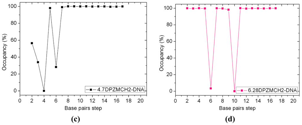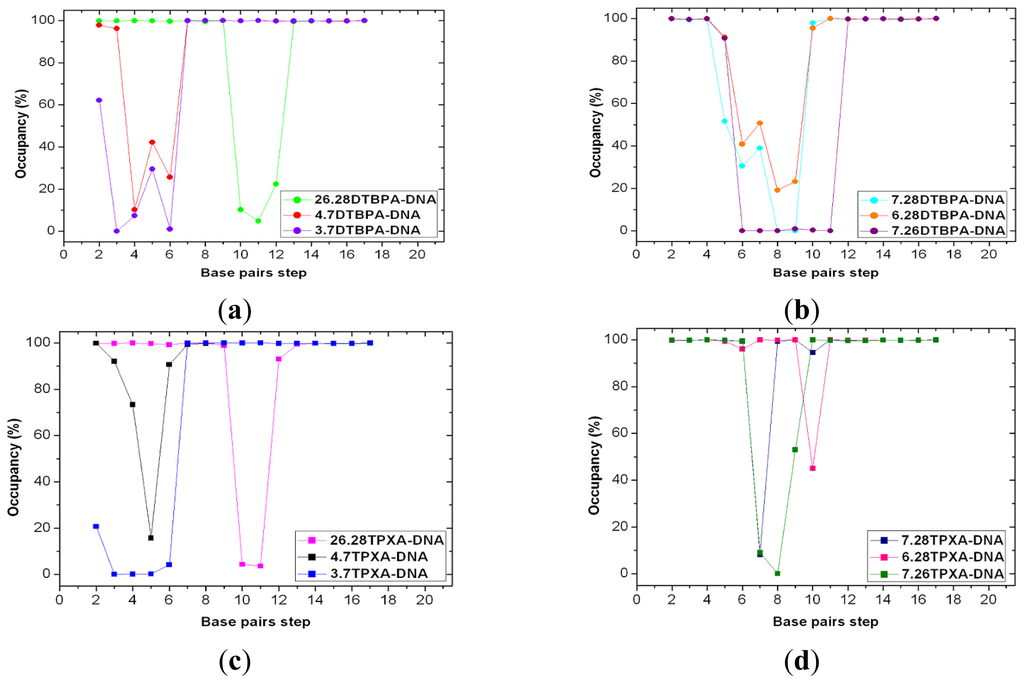 The 12 platinum-DNA adduct models (six [Pt2(DTBPA)Cl2](II)+DNA adducts: 26.28DTBPA-DNA, 4.7DTBPA-DNA, 3.7DTBPA-DNA, 7.28DTBPA-DNA, 6.28DTBPA-DNA and 7.26DTBPA-DNA; and six [Pt2(TPXA)Cl2](II) + DNA adducts: 26.28TPXA-DNA, 4.7TPXA-DNA, 3.7TPXA-DNA, 7.28TPXA-DNA, 6.28TPXA-DNA and 7.26TPXA-DNA) were studied by performing 50-ns unrestrained molecular dynamics simulations. The root-mean-square deviation (RMSD) values for all the backbone atoms, referenced to the corresponding starting structures, over 12 trajectories for the various intra-/inter-strand cross-linking models of the platinum-DNA adduct, were examined to determine if each system had attained equilibrium. A small RMSD value for a simulation is often considered to indicate that the system is in a stable state, whereas large RMSD values suggest the occurrence of large conformational changes. Plots of the RMSDs of the 12 platinum-DNA system simulations over time are shown in Figure 1. The calculated conformational free energies of the platinum-DNA systems as a function of time, during the last 10 ns of the simulation, were analyzed [5,37]. The corresponding results for the 4.7DTBPXA-DNA, 6.28DTBPA-DNA, 4.7TPXA-DNA and 6.28TPXA-DNA models are shown in Figure A1 (a, b, c and d, respectively). It may be seen from Figures 1 and A1 that the platinum-DNA adduct systems reached equilibrium after 10 ns, and that their energies were found to be stable during the remainder of each simulation. Therefore, the trajectory analysis for the 12 systems extracted the equilibrated conformations between 10 ns and 50 ns of the simulation time, recording 20,000 snapshots at 2-ps time intervals for each trajectory. The analyses of the hydrogen bonds of the DNA base pairs and the DNA-groove parameters around the binding sites of the DNA were performed using the time-averaged structures for these models, and are shown in Table 1, Figures 2 and 3.