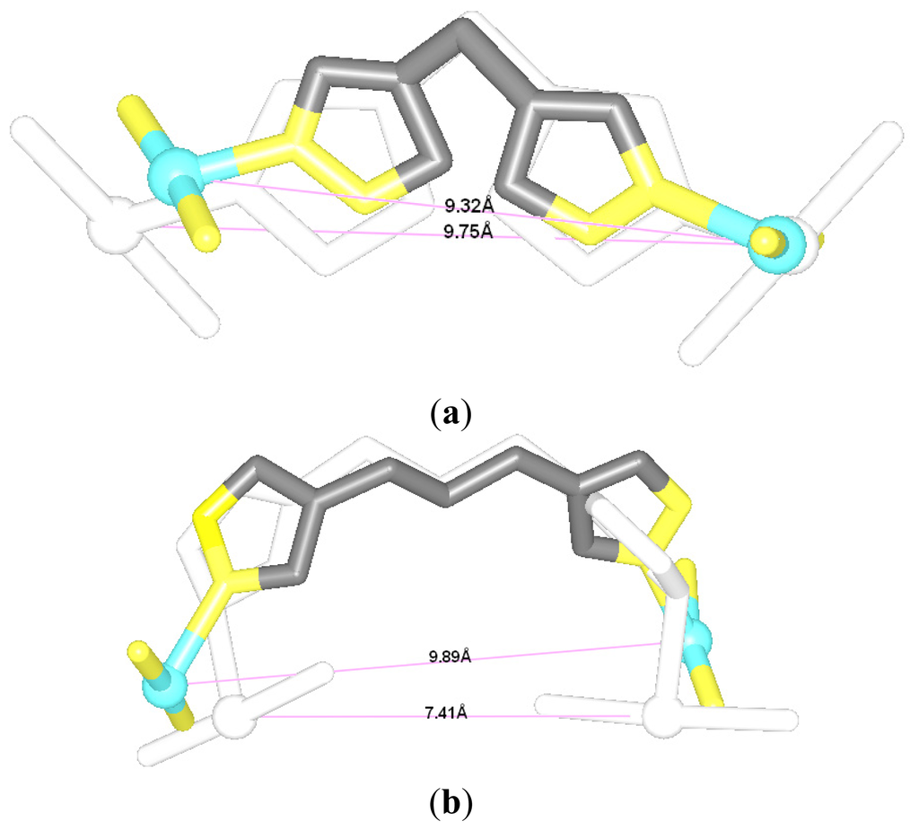 The [Pt2(DTBPA)Cl2](II) agent consists of a large cyclam ring linker and two trans-platinum(II) centers, each of which is coordinated by one chloride and one nitrogen each from the cyclam ring acetamide and pyridyl groups. The [Pt2(TPXA)Cl2](II) agent consists of a small benzene ring linker and two cis-platinum(II) centers, each of which is coordinated in a square-planar geometry by one chloride and three nitrogen atoms from each bis(2-pyridylmethyl)amine (BPA) moiety. The conformational characteristics of the DNA binding processes for these two platinum(II) antitumor agents are expected to differ, due to the different ligands and linkers of the platinum(II) centers [24,25]. In order to compare the conformational flexibility of [Pt2(DTBPA)Cl2](II) and [Pt2(TPXA)Cl2](II), the average platinum-platinum distances of these platinum-DNA adducts were evaluated before and after simulation, using the conformation overlap method. Figure 4 shows the full-overlap conformations of [Pt2(DTBPA)Cl2](II) and [Pt2(TPXA)Cl2](II) between the crystal structures and averaged structures during the 50-ns simulations. It may be seen from Figure 4 that the average platinum-platinum distance values for [Pt2(DTBPA)Cl2](II) and [Pt2(TPXA)Cl2](II) change, during simulation, from 9.70 Å and 9.07 Å in the crystal structures to 9.63 Å and 6.98 Å in the platinum-DNA adducts. Such small rangeability of the platinum-platinum distance for [Pt2(DTBPA)Cl2](II), which has a large-sized linker, during the simulations demonstrates that it has a more rigid conformation than [Pt2(TPXA)Cl2](II), which has a smaller-sized linker.