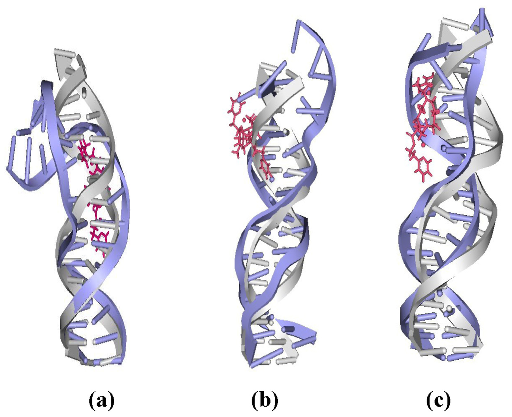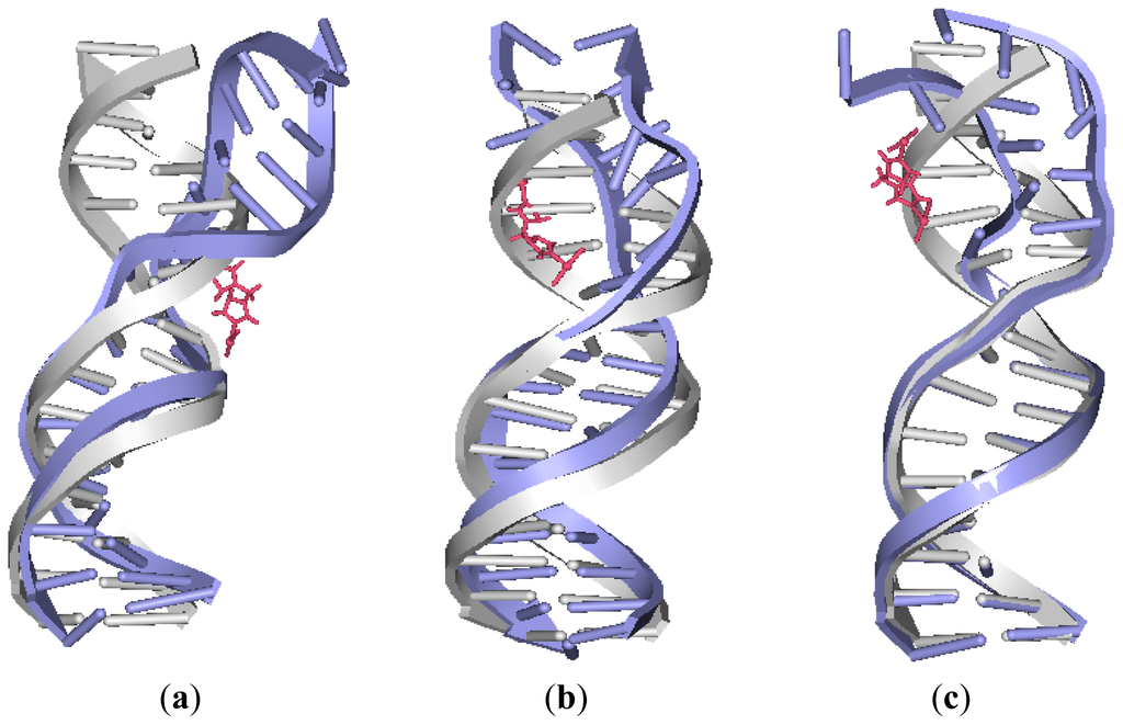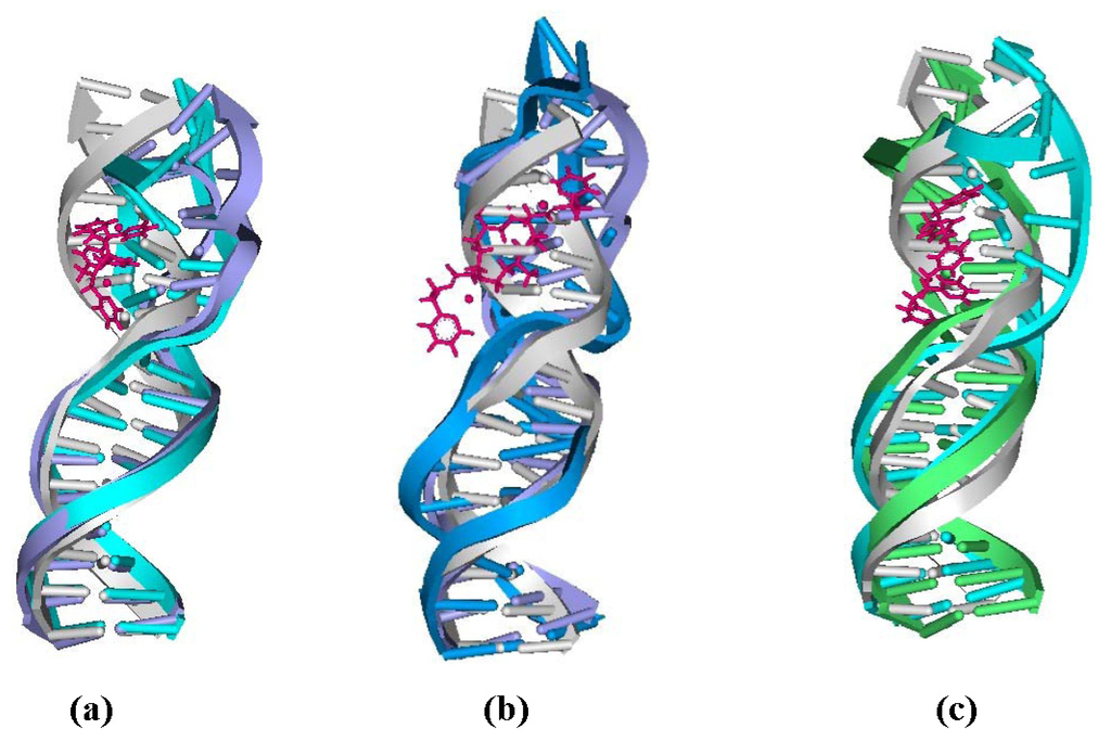 The averaged centroid structures of the platinum-DNA adduct and an undamaged B-DNA for: (a) 26.28DPZM-DNA; (b) 4.7DPZM-DNA; and (c) 3.7DPZM-DNA. [Pt2(DPZM)Cl2](II) is shown as pink, bound-DNA as blue, and B-DNA as gray.