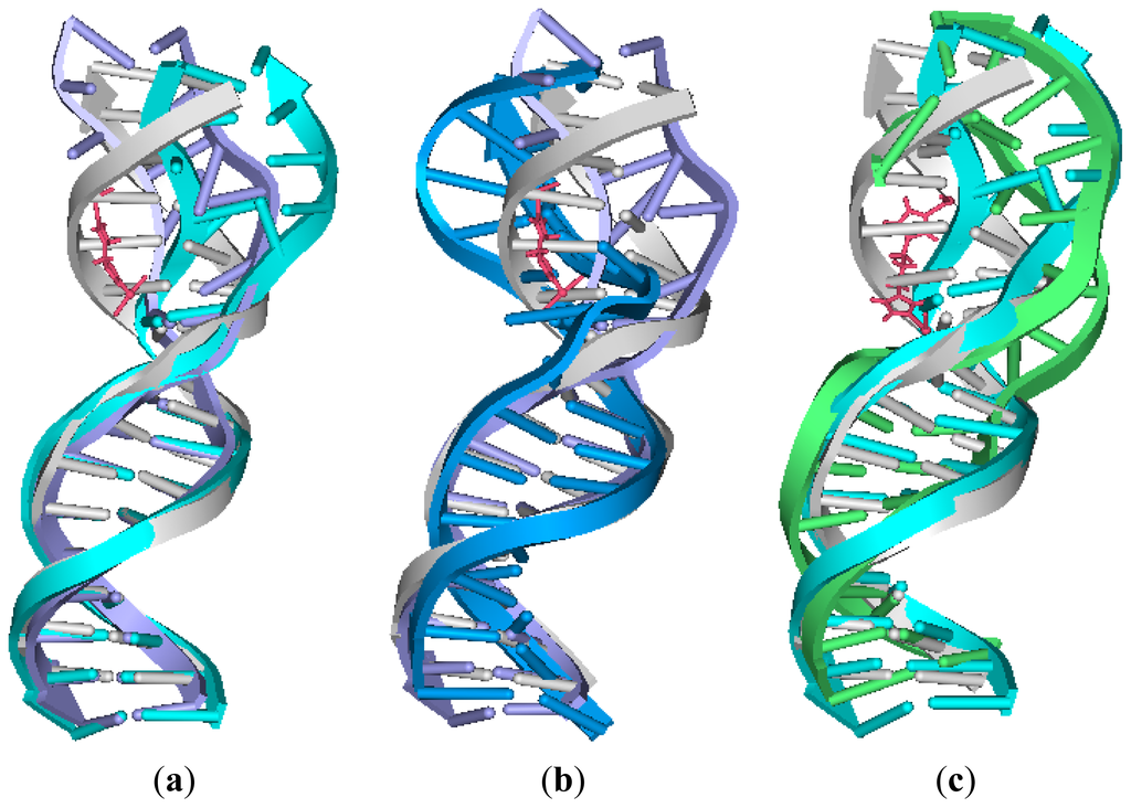 To address the effects of the platinum–platinum distance and platinum-bound N7–N7 distance on the extent of the distortion of the DNA conformation in the platinum-DNA adduct, the overlaps of the averaged structures for intra-1,3-GG cross-linking 26.28DTBPA-DNA, intra-1,4-GG cross-linking 4.7DTBPA-DNA and intra-1,5-GG cross-linking 3.7DTBPA-DNA were compared with a bare DNA molecule (Figure 5). The platinum-bound N7–N7 distance in the three models was used as a test parameter for the degree of the DNA conformational distortion. The platinum-bound N7–N7 distances in DNA and Pt–Pt distances in the platinum agents for the three models and for the B-DNA molecule are shown in Table 2. Of the three models, the platinum–platinum distance in the [Pt2(DTBPA)Cl2](II) agent most closely corresponded to the platinum-bound N7–N7 distance in the intra-1,4-GG cross-linking 4.7DTBPA-DNA. It may be seen from Table 2 that the difference in the N7–N7 distance between the B-DNA molecule and the averaged platinum-bound adduct was 2.22 Å for the intra-1,3-GG cross-linking 26.28DTBPA-DNA, and 3.76 Å for the intra-1,5-GG cross-linking 3.7DTBPA-DNA adducts, but only 0.38 Å for the intra-1,4-GG cross-linking 4.7DTBPA-DNA. Moreover, as shown in Figure 2a, the sum of the percentages of the hydrogen bonds destroyed at the bases, in comparison with the B-DNA molecule, was 262.55% for 26.28DTBPA-DNA (A10, 89.79%; C11, 95.13%; and A12, 77.63%) and 404.57% for 3.7DTBPA-DNA (A2, 37.87%; A3, 100%; G4, 92.66%; A5, 75%; and A6, 99.04%), but only 202.05% for 4.7DTBPA-DNA (G4, 69.88%; A5, 57.79%; and A6, 74.38%). The differences in the bend angles of the DNA molecule toward the minor groove between the B-DNA molecule and each adduct were 20.46° for 26.28DTBPA-DNA, 33.60° for 3.7DTBPA-DNA, and only 15.68° for 4.7DTBPA-DNA (see Table 1 and Figure 3). As would be expected, Figure 5 indicates visually that the distortion of the average DNA conformation, compared with the B-DNA molecule, was also larger for both 26.28DTBPA-DNA and 3.7DTBPA-DNA models than for 4.7DTBPA-DNA model. Therefore, large differences between the platinum–platinum distance in the platinum agent and the platinum-bound N7–N7 distance in the DNA molecule can cause substantial distortions of the DNA conformation during the process of platinum-DNA adduct formation. Similar results were observed for the [Pt2(TPXA)Cl2](II) agent and the inter-strand cross-linking models, except for the fact that the effect on the conformationally-rigid [Pt2(DTBPA)Cl2](II) agent was more obvious than that on [Pt2(TPXA)Cl2](II), which has a more flexible conformation.