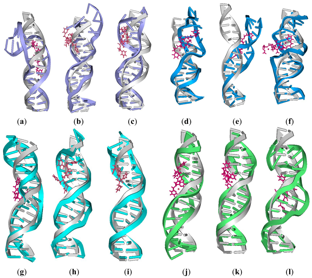 The average centroid structures of the 12 platinum-DNA adducts studied (pink for [Pt2(DTBPA)Cl2](II) and [Pt2(TPXA)Cl2](II); blue for intra-strand [Pt2(DTBPA)Cl2](II)-bound DNA; navy for inter-strand [Pt2(DTBPA)Cl2](II)-bound DNA; cyan for intra-strand [Pt2(TPXA)Cl2](II)-bound DNA, green for inter-strand [Pt2(TPXA)Cl2](II)-bound DNA; gray for B-DNA): (a) 26.28DTBPA-DNA; (b) 4.7DTBPA-DNA; (c) 3.7DTBPA-DNA; (d) 7.28DTBPA-DNA; (e) 6.28DTBPA-DNA; (f) 7.26DTBPA-DNA; (g) 26.28TPXA-DNA; (h) 4.7TPXA-DNA; (i) 3.7TPXA-DNA; (j) 7.28TPXA-DNA; (k) 6.28TPXA-DNA; (l) 7.26TPXA-DNA.