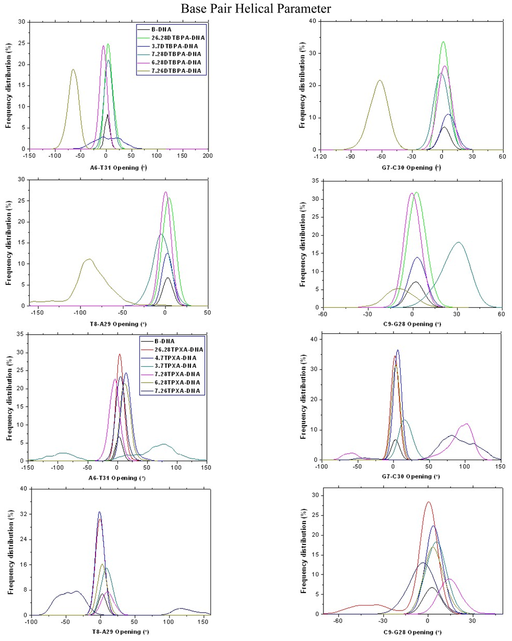 Selected frequency distributions of the representative DNA duplex base-pair helical parameters and base-pair step parameters for the central binding base-pairs of B-DNA (black), 26.28DTBPA-DNA (green), 3.7DTBPA-DNA (blue), 7.28DTBPA-DNA (dark cyan), 6.28DTBPA-DNA (magenta) and 7.26DTBPA-DNA (dark yellow); and 26.28TPXA-DNA (red), 4.7TPXA-DNA (blue), 3.7TPXA-DNA (dark cyan), 7.28TPXA-DNA (magenta), 6.28TPXA-DNA (dark yellow) and 7.26TPXA-DNA (navy).