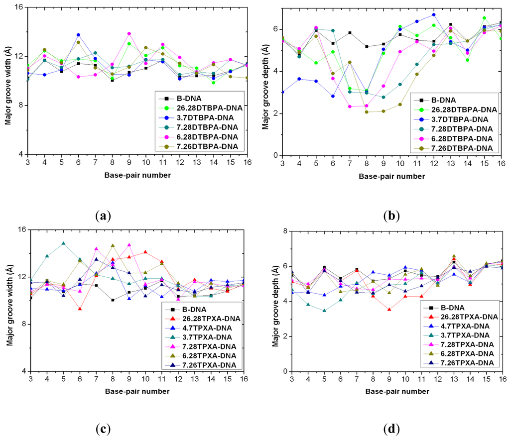 Major groove widths and depths for the time-averaged structures of the DNA conformations of the other 11 platinum-DNA adducts. Major groove width (a) and depth (b) for [Pt2(DTBPA)Cl2](II) are shown for: B-DNA (black squares); 26.28DTBPA-DNA (green circles); 3.7DTBPA-DNA (blue circles); 7.28DTBPA-DNA (dark cyan circles); 6.28DTBPA-DNA (magenta circles); and 7.26DTBPA-DNA (dark yellow circles). Major groove width (c) and depth (d) for [Pt2(TPXA)Cl2](II) are shown for: B-DNA (black squares); 26.28TPXA-DNA (red triangles); 4.7TPXA-DNA (blue triangles); 3.7TPXA-DNA (dark cyan triangles); 7.28TPXA-DNA (magenta triangles); 6.28TPXA-DNA (dark yellow triangles); and 7.26TPXA-DNA (navy triangles).