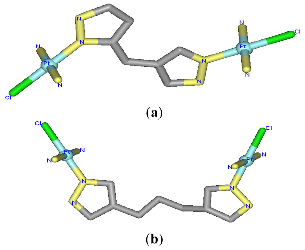 X-ray structures for (a) trans-[Pt2(DPZM)Cl2](II), and (b) cis-[Pt2(DPZMCH2)Cl2](II).