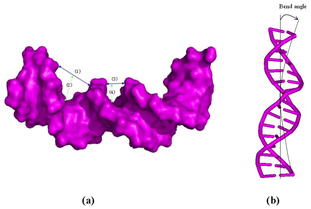 (a) The width and depth of the major groove of the time-averaged DNA conformation are shown as blue line (1) and green line (2), respectively, and the width and depth of the minor groove are shown as blue line (3) and green line (4), respectively; (b) The bend angles of the time-averaged DNA conformation.
