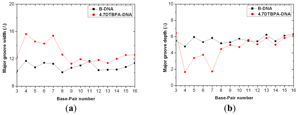 Major groove width (a) and depth (b) for the time-averaged structure of the DNA conformation of the 4.7DTBPA-DNA model (red line with circles), compared with B-DNA (black line with squares).