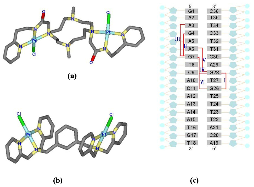 X-ray structures for (a) [Pt2(DTBPA)Cl2](II); and (b) [Pt2(TPXA)Cl2](II); (c) the 18-mer duplex DNA sequence and the six platinum-DNA cross-linking modes for [Pt2(DTBPA)Cl2](II) studied in this work, along with their assigned names. Three types of intra-strand cross-links (I: 26.28DTBPA-DNA; II: 4.7DTBPA-DNA; and III: 3.7DTBPA-DNA), and three types of inter-strand cross-links (IV: 7.28DTBPA-DNA; V: 6.28DTBPA-DNA; and VI: 7.26DTBPA-DNA) were studied. Similar nomenclature was used for [Pt2(TPXA)Cl2](II).