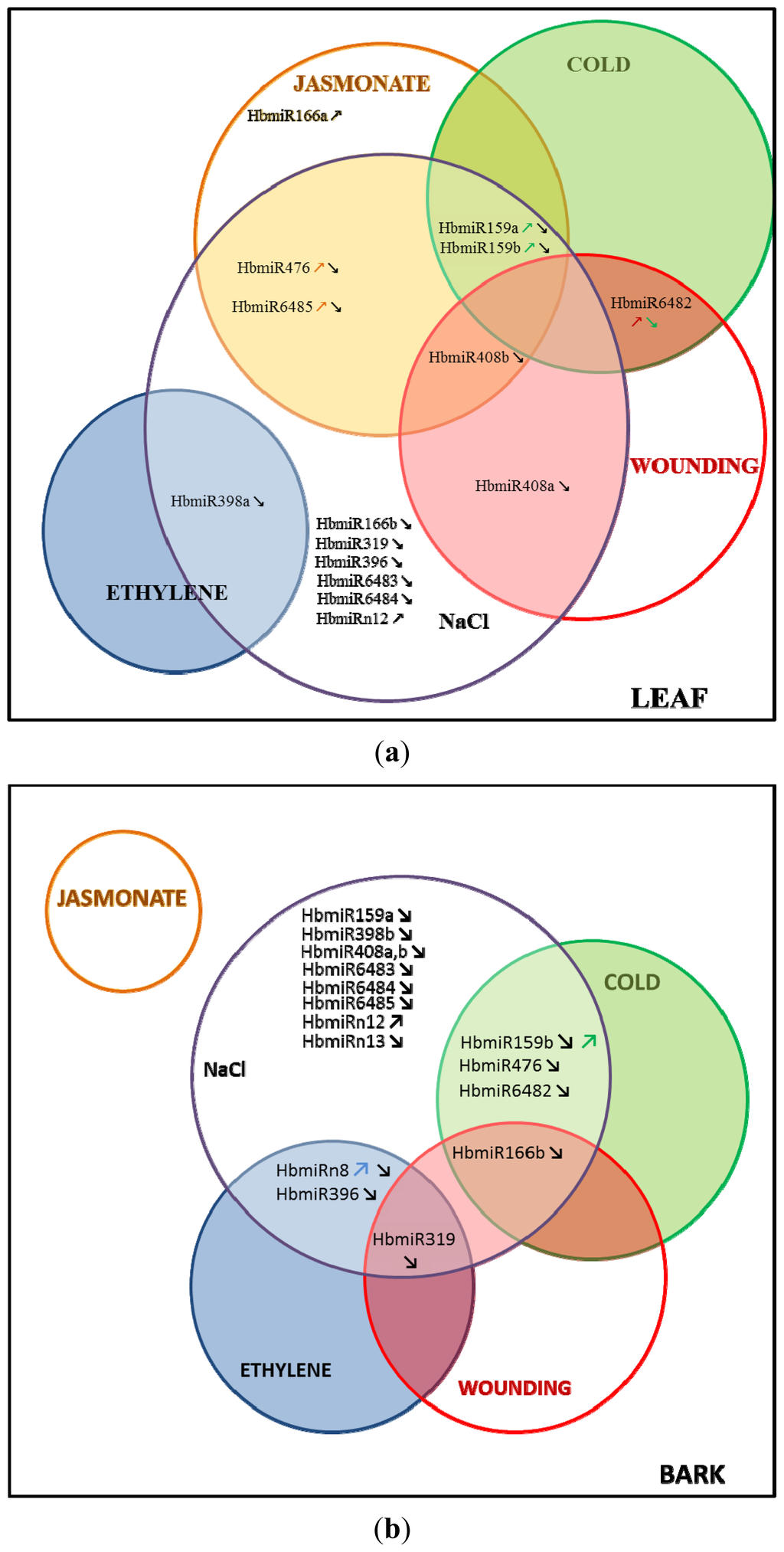 Venn diagram representing the regulation of the MIR genes common to all the treatments tested. (a): in leaves; and (b): in bark.