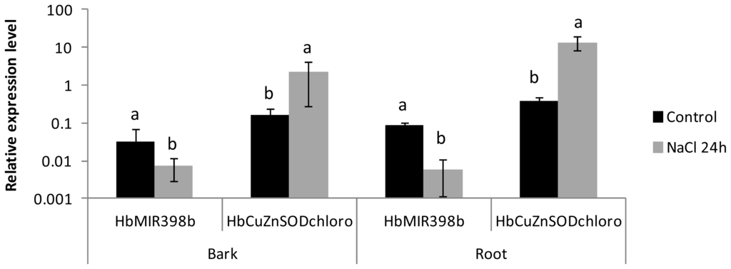 When the relative expression level for the HbMIR398 gene was compared with the expression data for the target, the significant reduction in the expression of the HbMIR398b gene in bark and roots in response to 24 h of saline stress was accompanied by a significant increase in the relative expression level for the non-cleaved chloroplastic HbCuZnSOD transcripts (Figure 3).