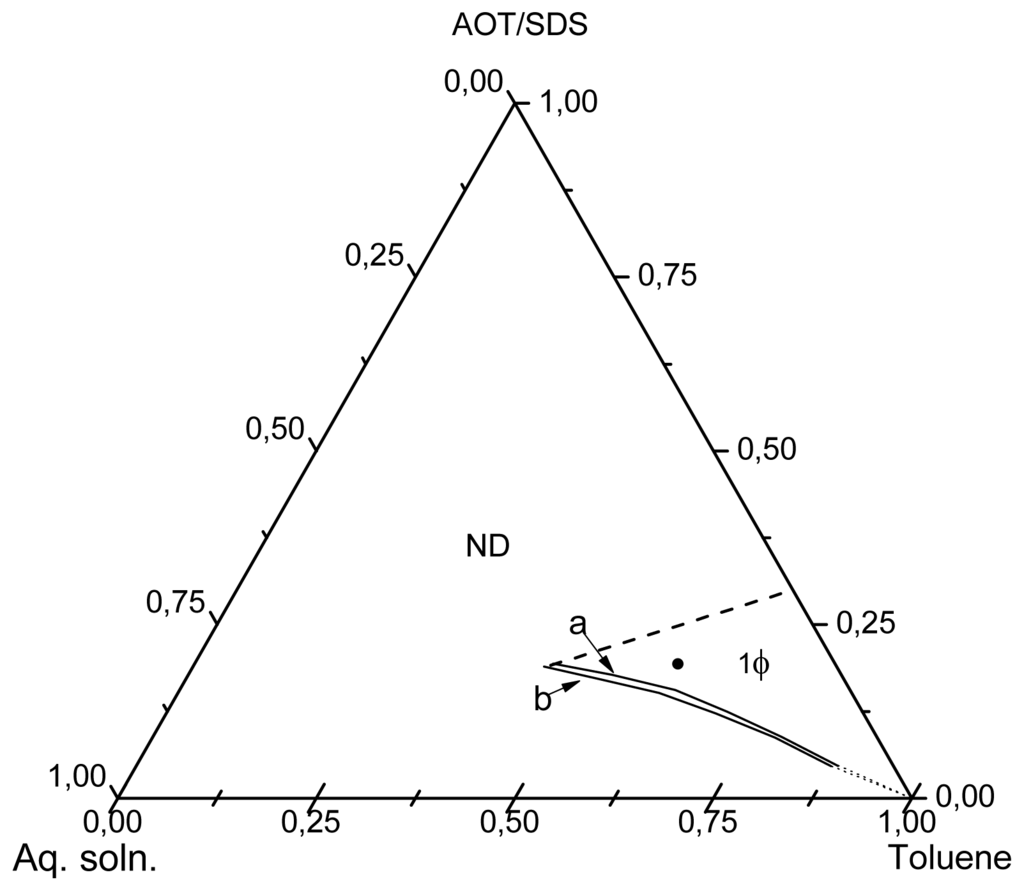 Phase diagram showing the microemulsion regions (1φ). The microemulsion composition used in the precipitation reactions is shown by (●). The limits of the microemulsion region at 70 °C and 80 °C, are represented by the lines (a) and (b), respectively. Non-determined region (ND) is not relevant for this work.
