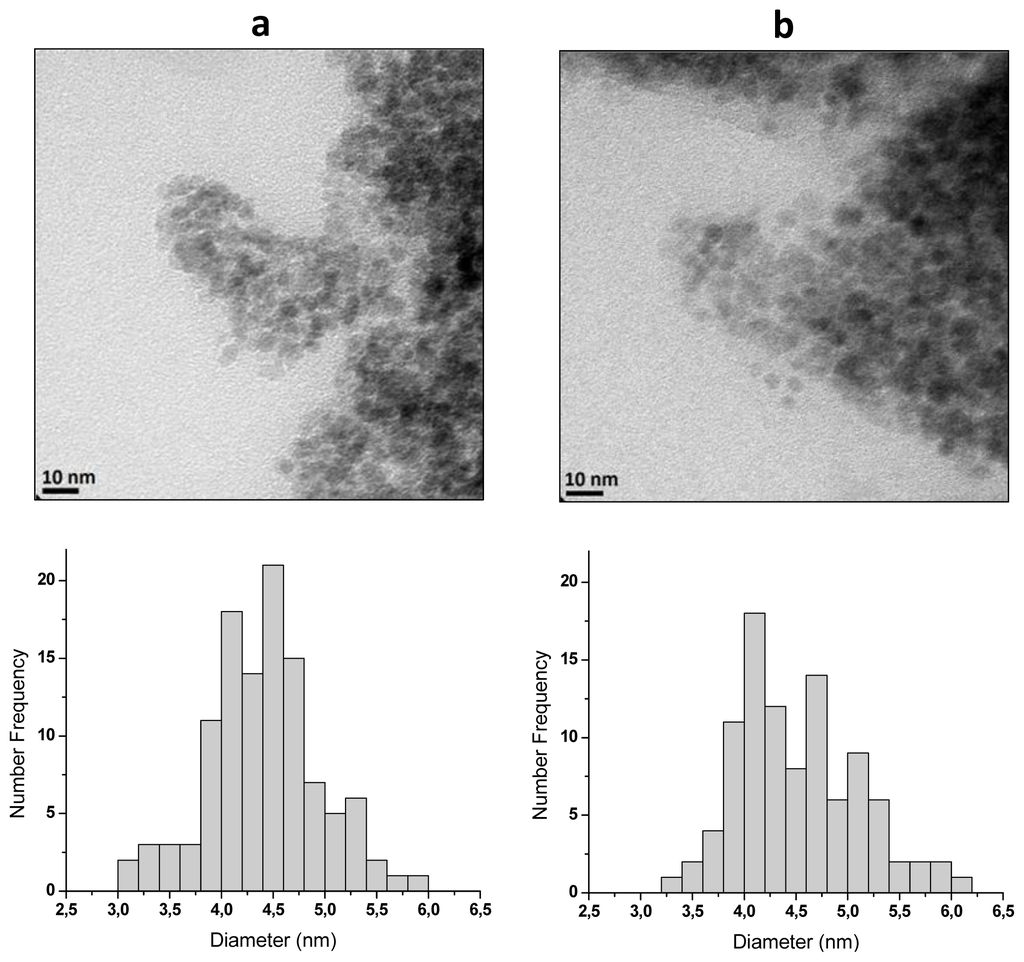 HRTEM micrographs of chitosan-coated magnetic nanoparticles: (a) MQ70; (b) MQ80. The corresponding histograms of particle sizes are also included.