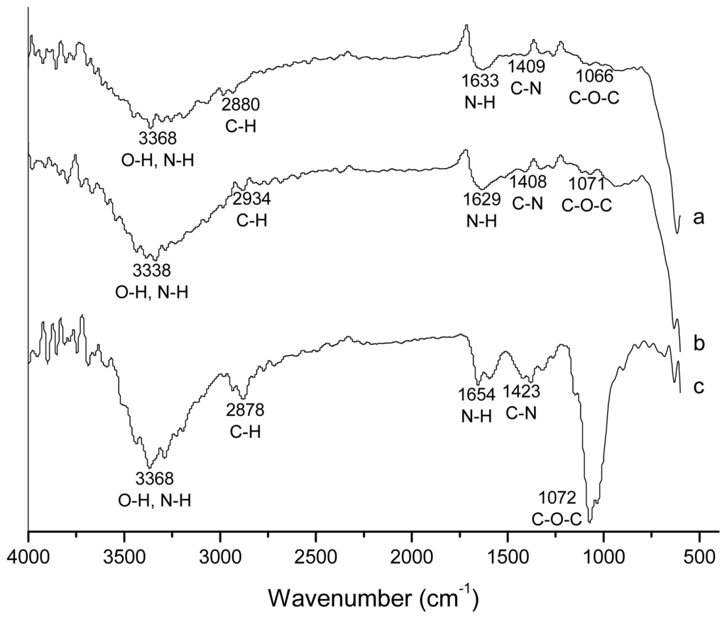 FTIR transmission spectra of magnetic nanoparticles prepared by microemulsion precipitation: (a) MQ70 and (b) MQ80; (c) Chitosan spectra is also included.