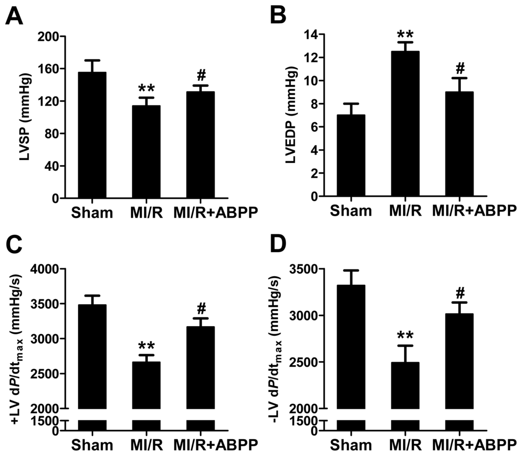 As shown in Figure 1, MI/R significantly impaired cardiac functions as evidenced by decreased left ventricular systolic pressure (LVSP) and the instantaneous first derivation of left ventricle pressure (± LV dP/dtmax) and increased LVEDP after 4 h of reperfusion (n = 8, p < 0.01). ABPP preconditioning improved cardiac function in MI/R rats, indicating that ABPP pretreatment markedly increased cardiac function during MI/R.