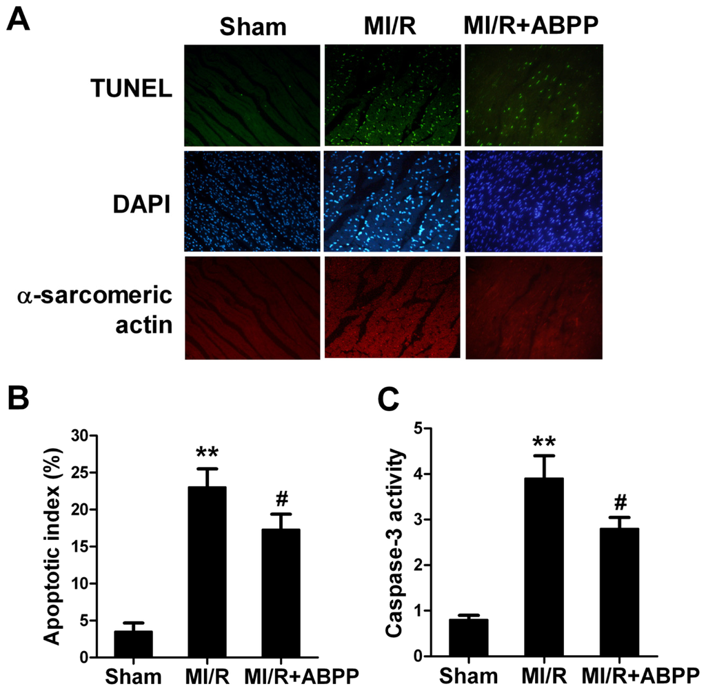 Apoptosis is a major form of cell death after a short period of ischemia followed by reperfusion. Here we observed the effects of ABPP on I/R-induced cardiomyocyte apoptosis. 4 h after reperfusion, a significant number of TUNEL-positive cells were observed in cardiac tissue (n = 8, p < 0.01 vs. Sham, Figure 3A). ABPP preconditioning exerted a significant anti-apoptotic effect as evidenced by reduced TUNEL-positive staining in rats (p < 0.05). To further examine whether ABPP preconditioning could decrease myocardial apoptosis, myocardial caspase-3 activity, a final common pathway in caspase-dependent apoptosis, was determined. MI/R increased caspase-3 activity in rats compared with Sham group (n = 8, p < 0.01, Figure 3B). ABPP treatment resulted in a significant reduction in caspase-3 activity in I/R rats (p < 0.05). All these results provided direct evidence that ABPP alleviated I/R-induced myocardial injury in rats.
