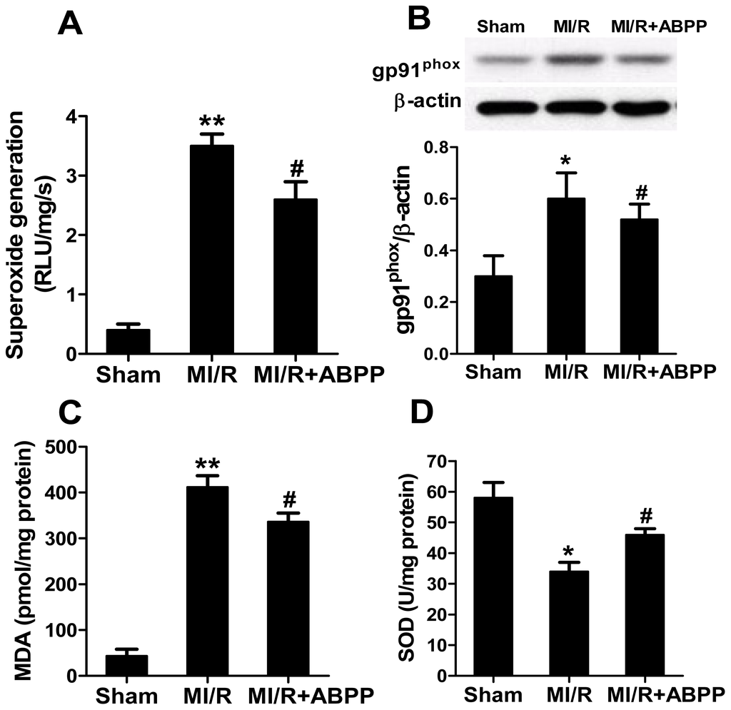 As seen in Figure 4A, compared with sham-operated hearts, I/R myocardium showed a significant increase in superoxide content (p < 0.01, Figure 4B), and ABPP preconditioning decreased superoxide accumulation (p < 0.05 vs. MI/R). Afterwards, we determined gp91phox expression, a major component of NADPH oxidase that is the most important superoxide-producing enzyme in I/R heart. As expected, ABPP treatment markedly decreased MI/R-stimulated gp91phox expression (p < 0.05, Figure 4B). In addition, MDA was observed as a biomarker to measure the level of oxidative stress. There was a robust increase in MDA production in I/R hearts compared with the sham group, and treatment with ABPP reduced this harmful effect (Figure 4C). In contrast, antioxidant enzyme SOD activity in cardiac tissue was also increased in I/R rats with ABPP preconditioning (Figure 4D). These results demonstrated that ABPP reduced superoxide overproduction and decreased oxidative stress in I/R hearts.