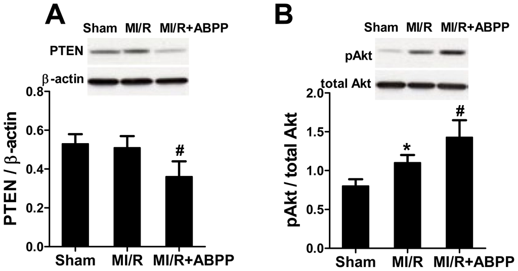 It is widely accepted that activation of the phosphatidylinositol-3-kinase (PI3K)/protein kinase B (Akt) pathway regulates myocardial oxidative stress and contributes to the cardioprotection against MI/R injury [7]. Phosphatase and tensin homolog deleted on chromosome 10 (PTEN), originally identified as a negative regulator of PI3K signaling, also plays an important role in regulating oxidative stress [8,9]. Previous study has indicated that ABPP-E4, an active fraction from ABPP, prevented apoptosis induced by serum deprivation in SH-SY5Y cells through PI3K/Akt signaling [10]. Nevertheless, whether ABPP regulates PTEN and Akt signaling following MI/R in vivo remains unknown.