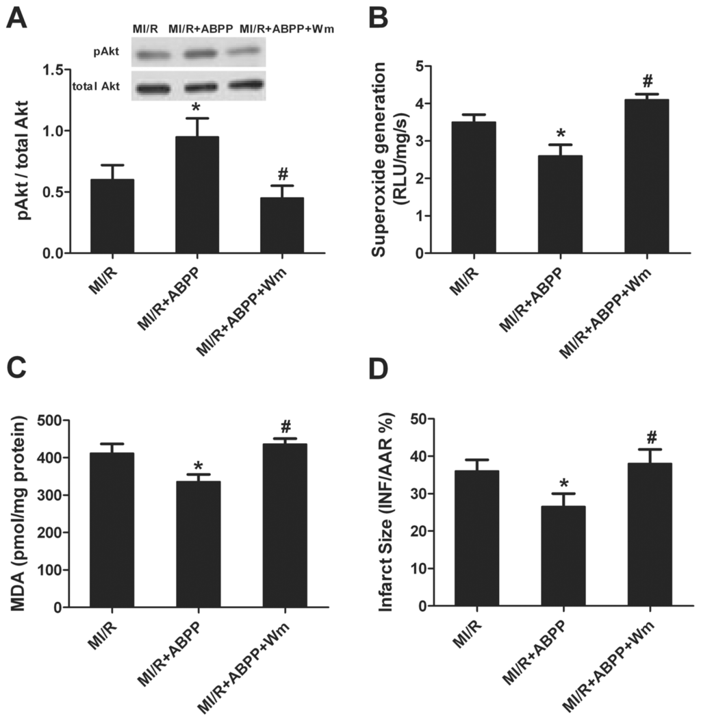 Our study demonstrated that ABPP preconditioning activated Akt. To determine whether ABPP stimulated cardioprotection through Akt signaling pathway, the PI3K inhibitor, wortmannin, was used. As seen in Figure 6A, there was no significant difference in Akt expression among all groups. Wortmannin markedly inhibited ABPP-enhanced Akt phosphorylation. Moreover, wortmannin significantly blocked the anti-oxidative defense of ABPP as evidence by increased superoxide generation (Figure 6B) and MDA formation (Figure 6C). In addition, myocardial infarct size was increased following wortmannin treatment (Figure 6D), indicating that the cardioprotection of ABPP was also abolished by wortmannin. These data revealed that ABPP alleviates MI/R-induced cardiac injury possibly via the PI3K/Akt signal pathway.